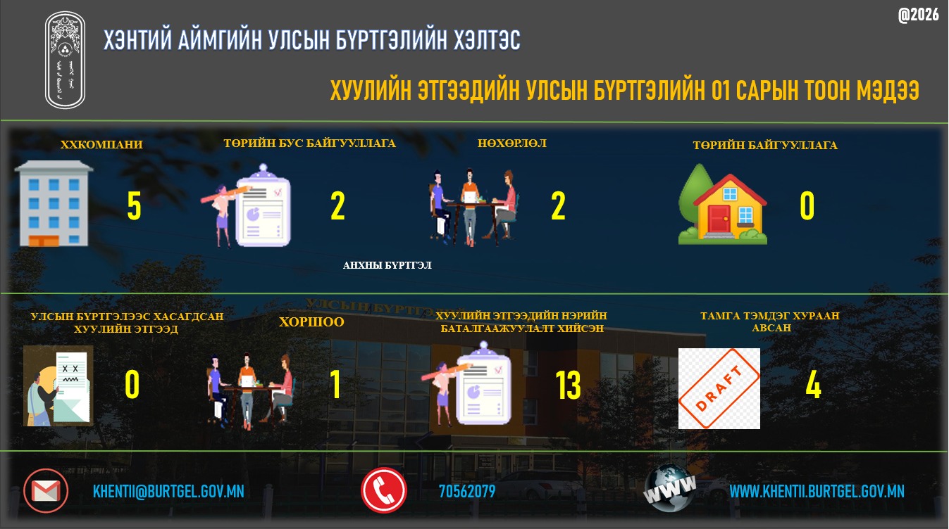 ХЭНТИЙ АЙМГИЙН УЛСЫН БҮРТГЭЛИЙН ХЭЛТСИЙН АЛБАН ХААГЧДАД ХУУЛЬ, ЭРХ ЗҮЙН СУРГАЛТ ЗОХИОН БАЙГУУЛЛАА.